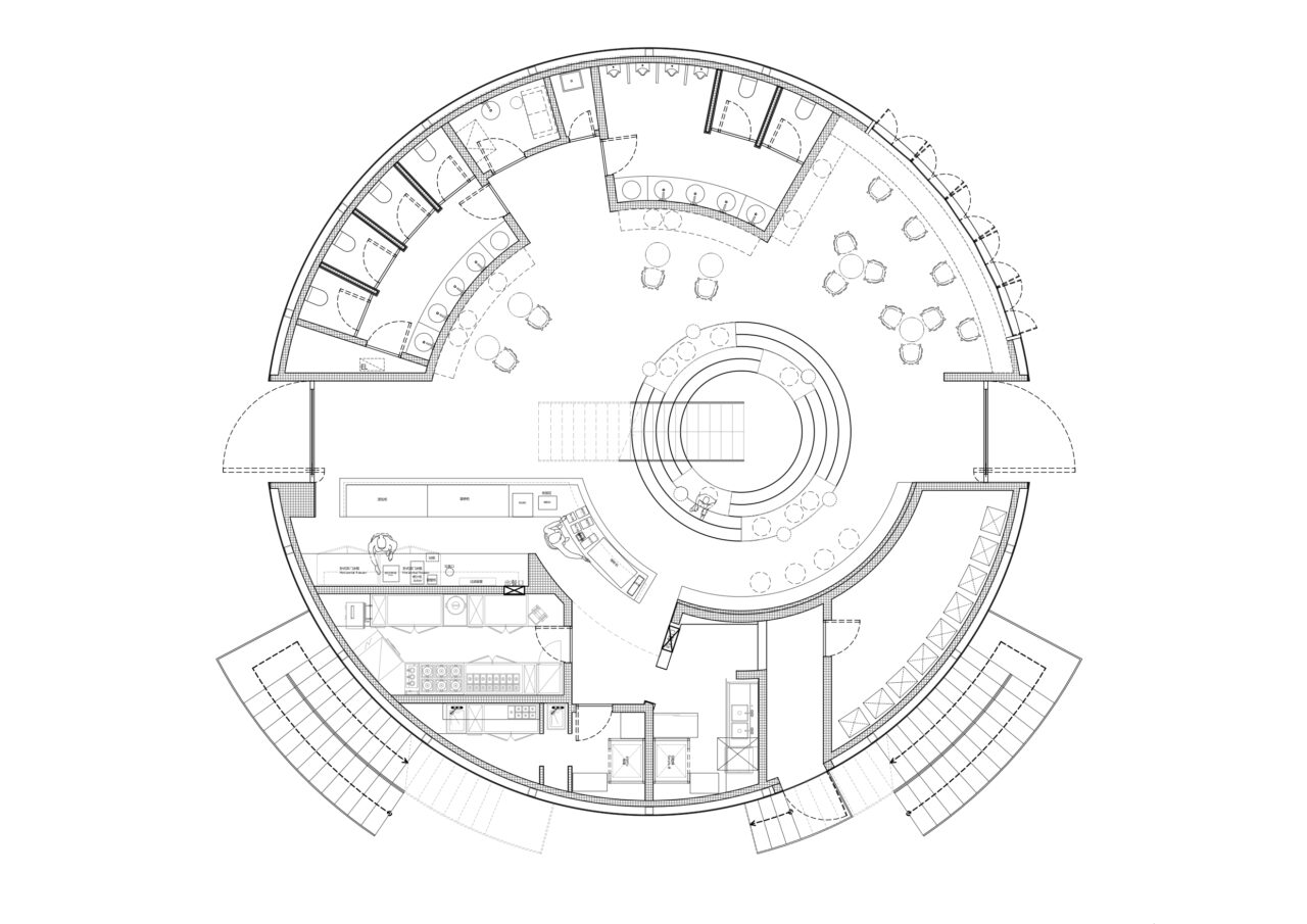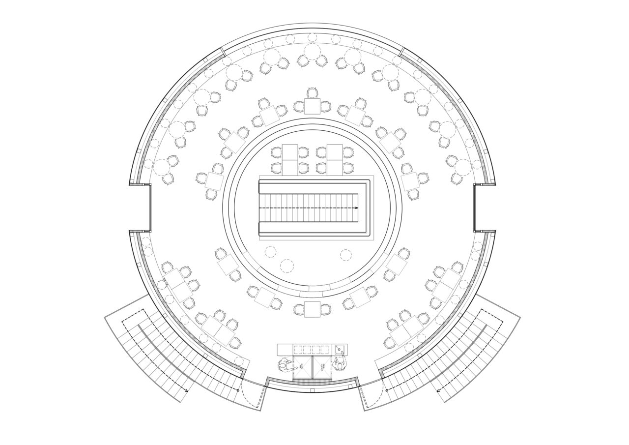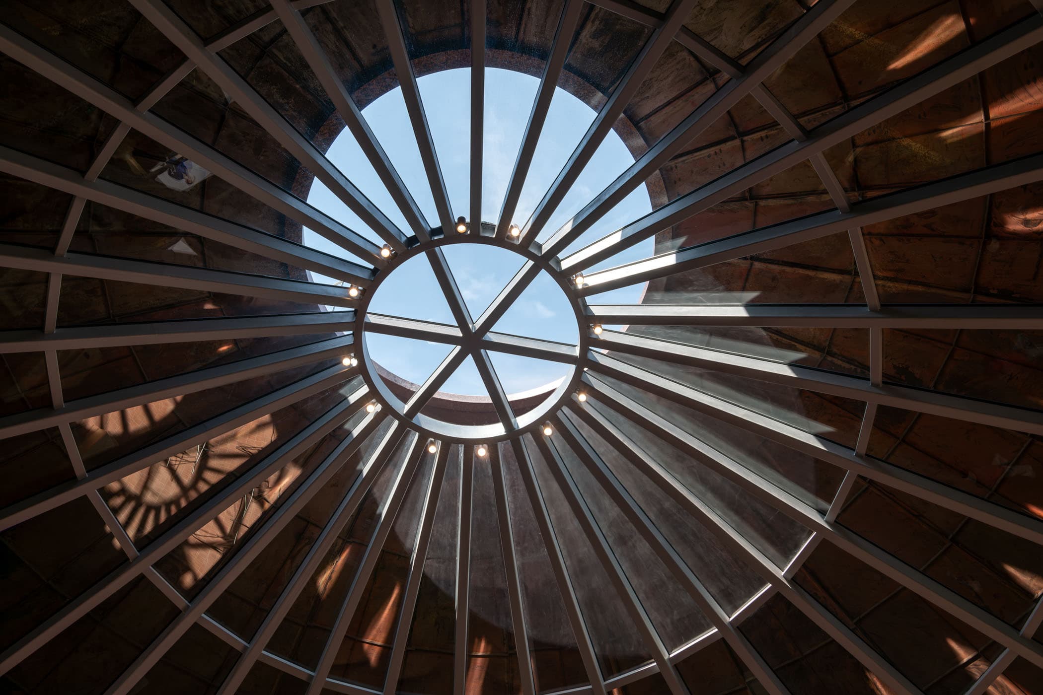 During our first site visit, a ray of sunlight gracefully descended from the top of the silos, casting a flawless ellipse of light on the stained walls. At that moment we realized that the essence of the project lays in preserving the tank walls and harnessing the ethereal lighting from above.