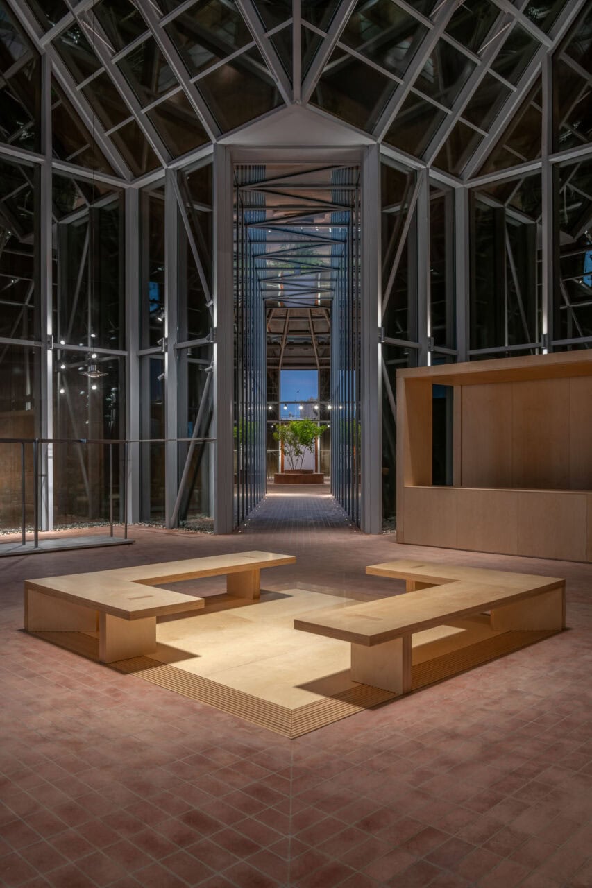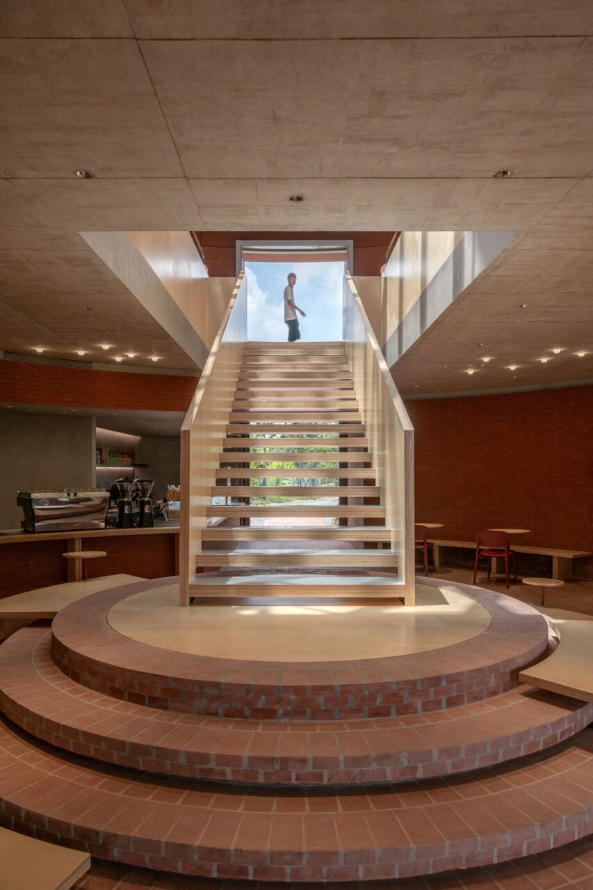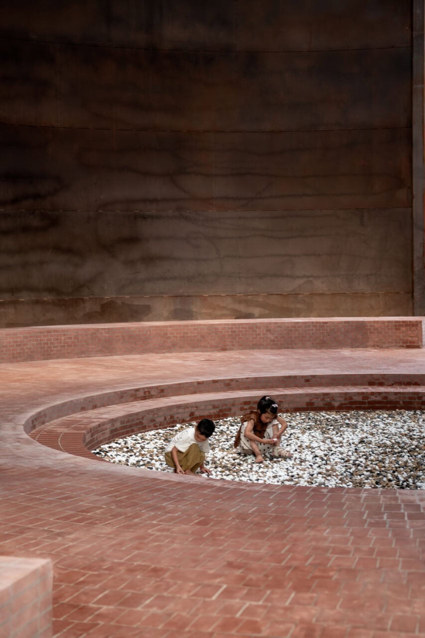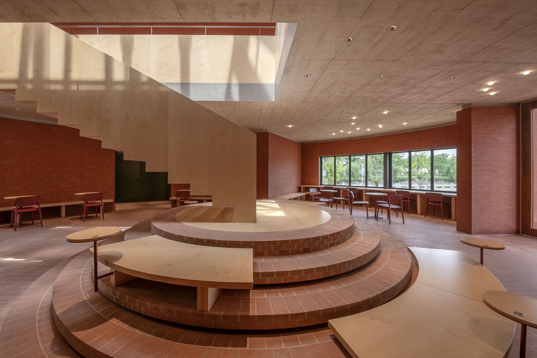 Next to the steel of the silos, we introduced one other material, inspired by the canal. This material pays homage to the steel barges that transport red bricks, supporting China's burgeoning developments. Here, these bricks are employed in a straightforward stack, giving rise to a distinct inner realm within the restaurant silo. Adjacent to the curved inner walls, they form pathways for visitors to traverse, providing guidance and grounding the site within its surroundings.