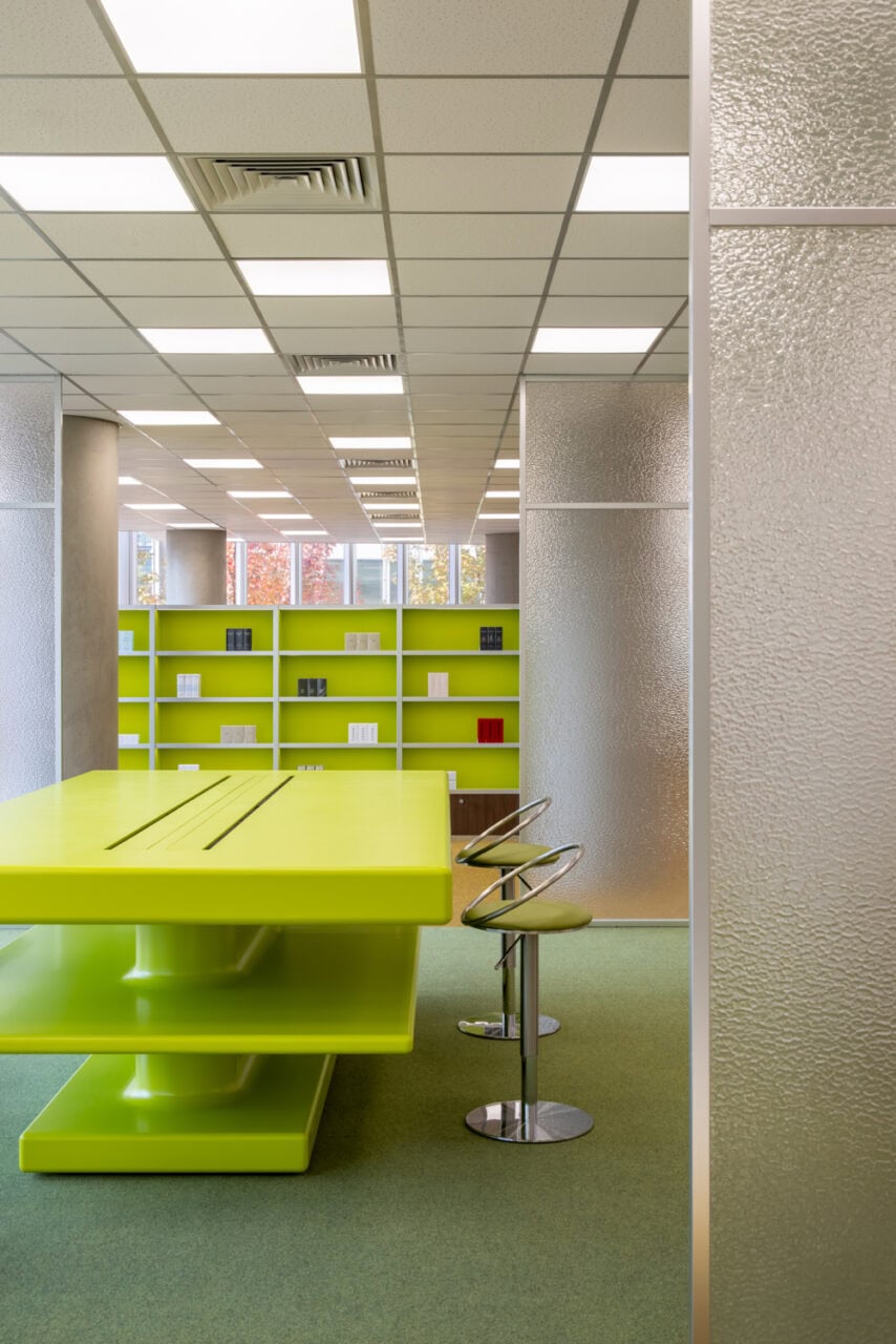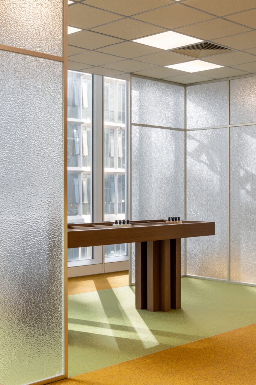 The open office floor plan is organized by loose set meeting rooms made of embossed glass, with big meeting tables used for product display.
