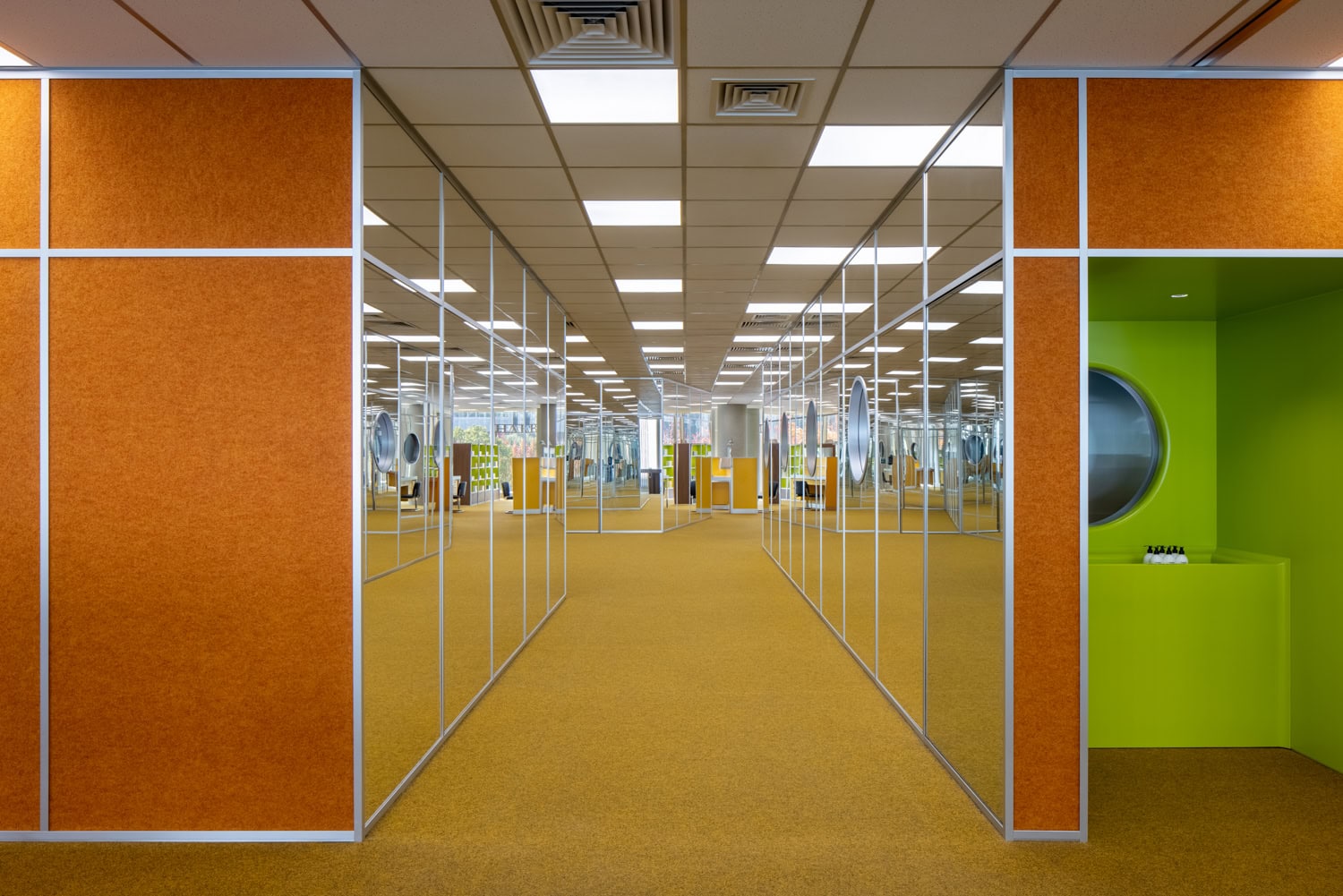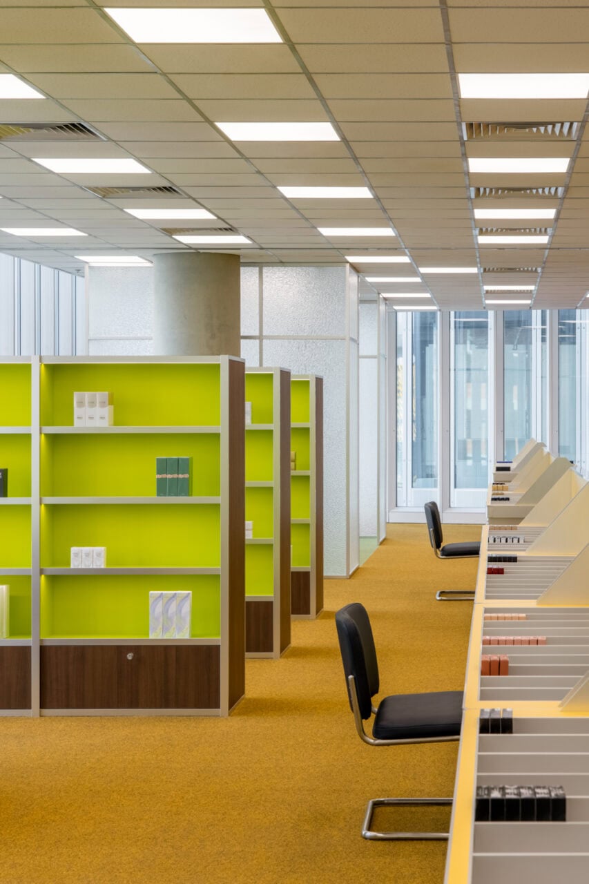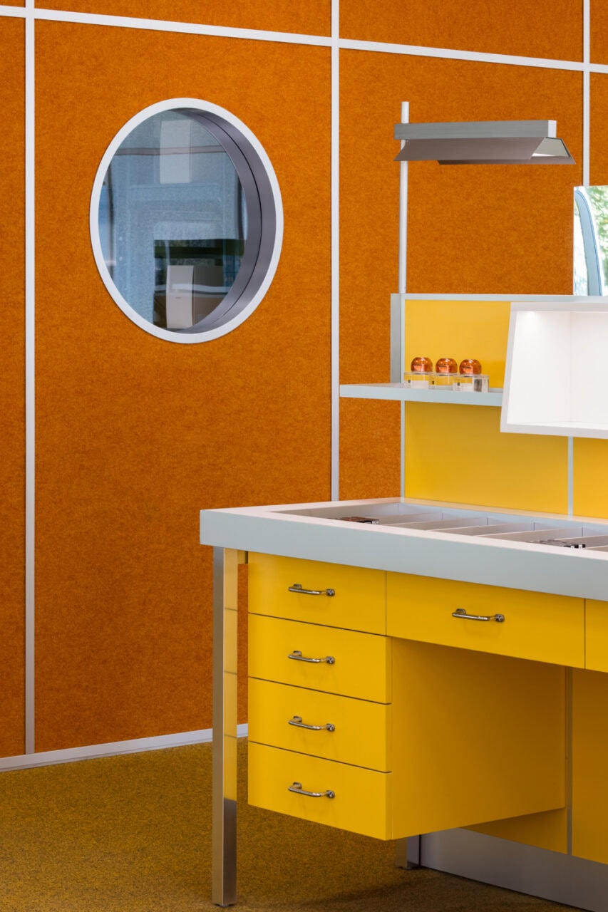 The repetition of the desk units and cabinets, make a powerful rhythm leading consumer around the office core where retro-future telephone rooms enrich the variety of the retail experience.