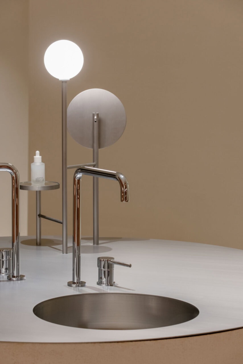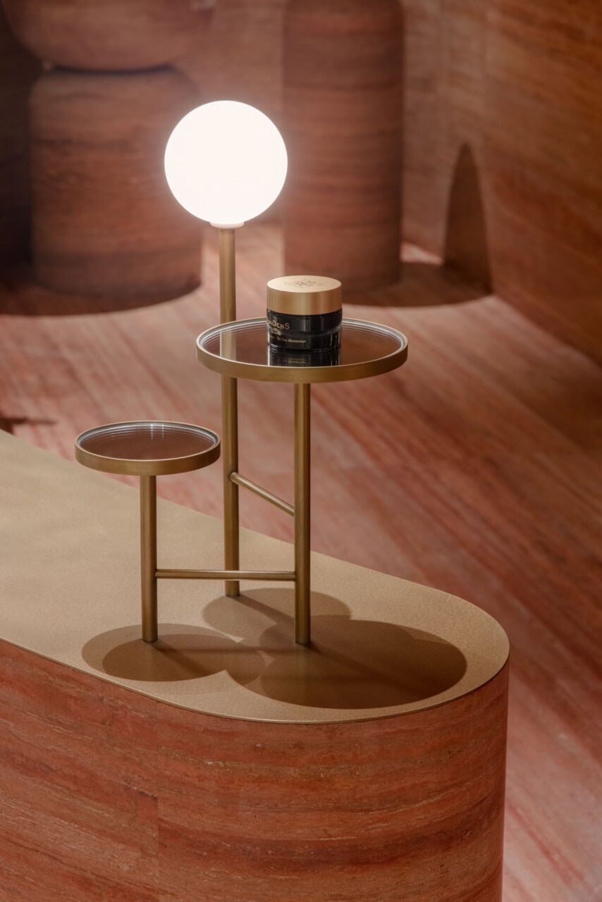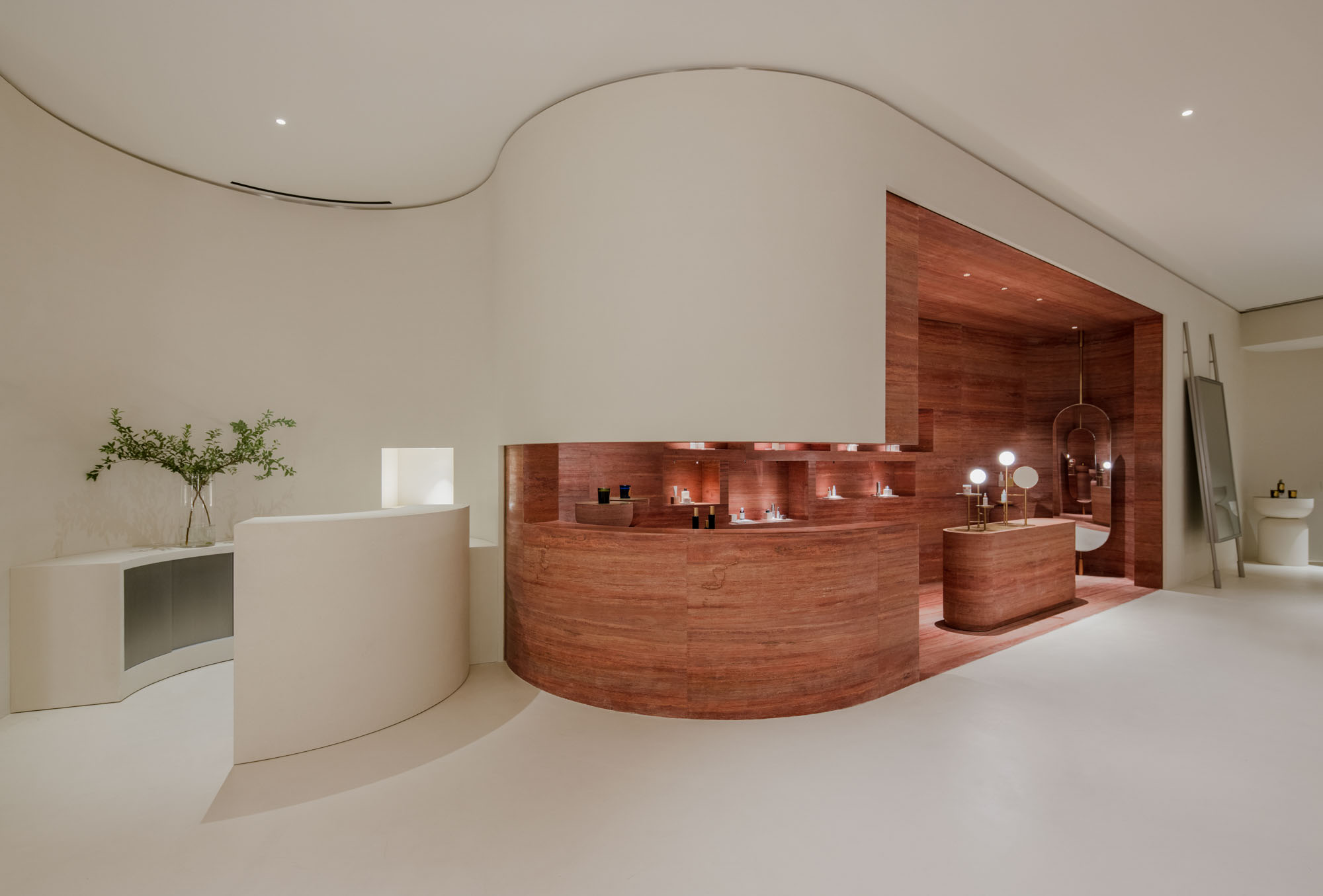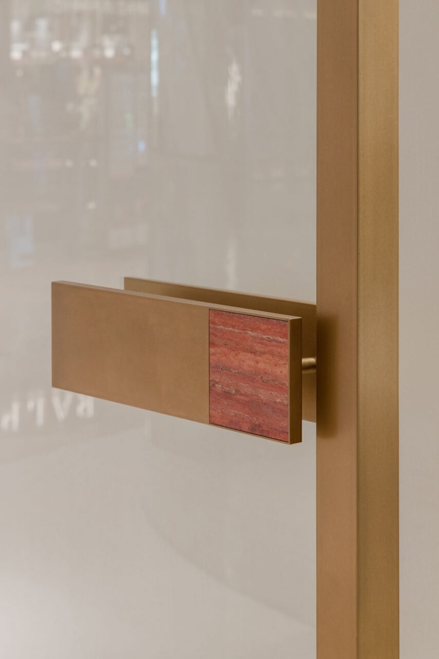 The use of round and powerful display objects adds another layer to the spatial experience. Carefully illuminated water basins built with raw white cement and the red stone, combined with brass lighting and mirrored display structures, add a delicate complexity to the overall well-balanced composition.