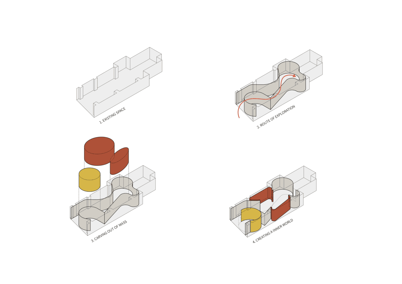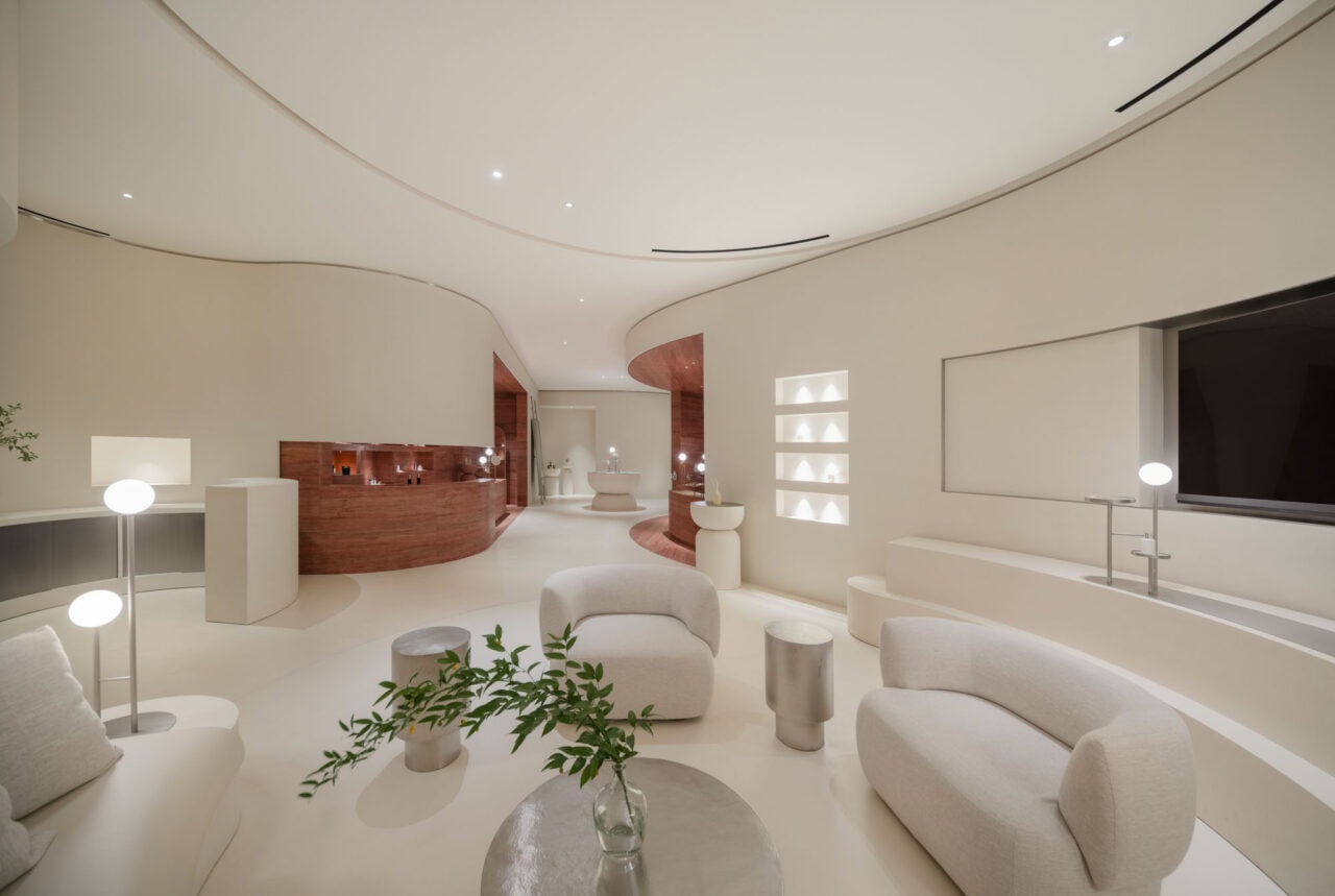 Taking an architectural approach to its interior, the space is carved out of a white stone mass, creating a continuous curved surface. It opens a route for exploration that carefully unveils its natural beauty and exposes multiple layers of an intricate inner organic world.