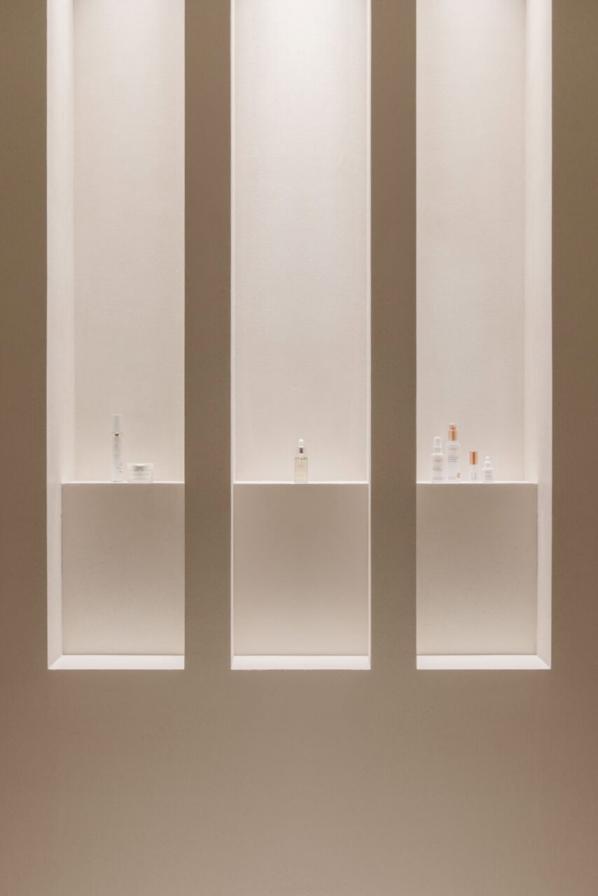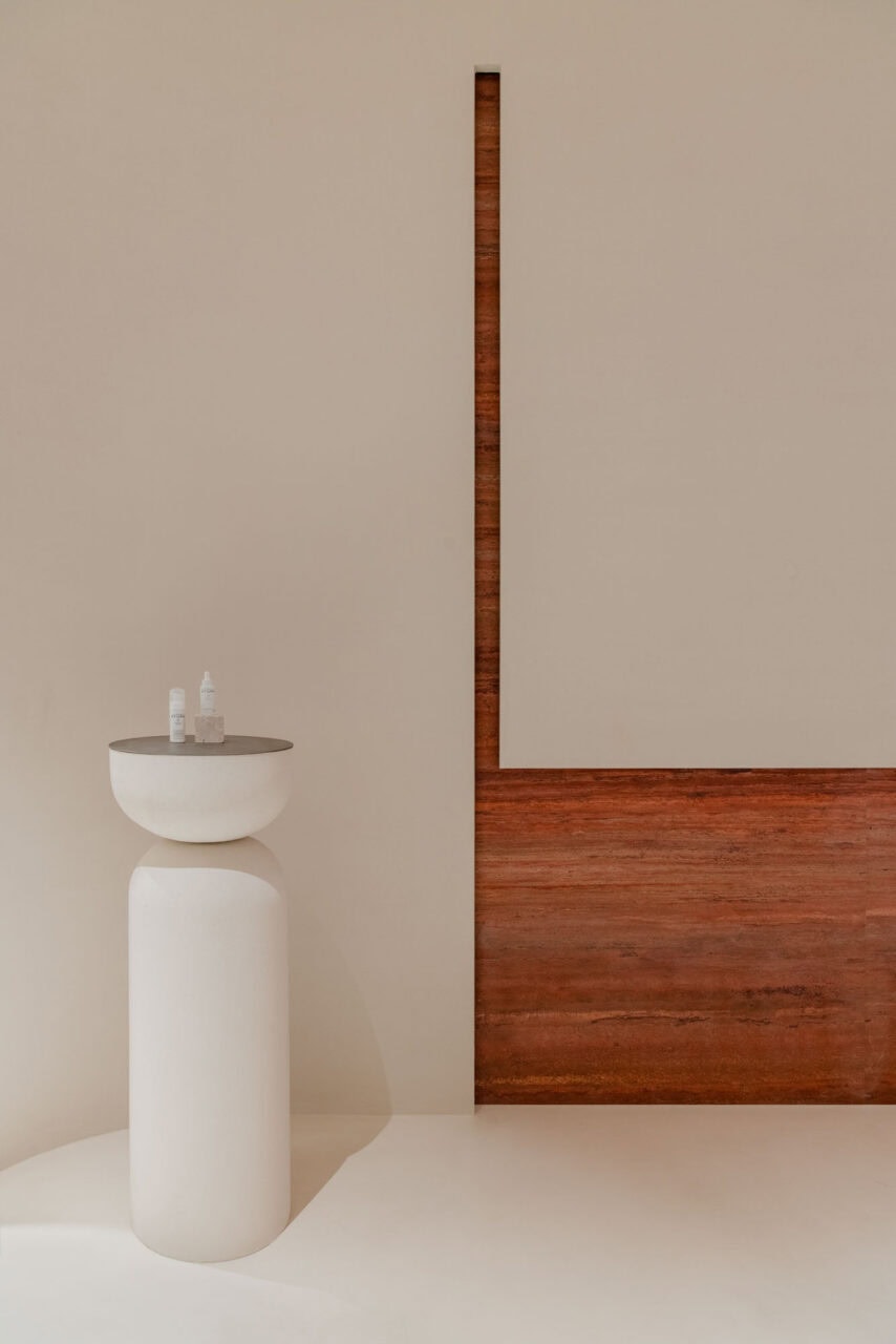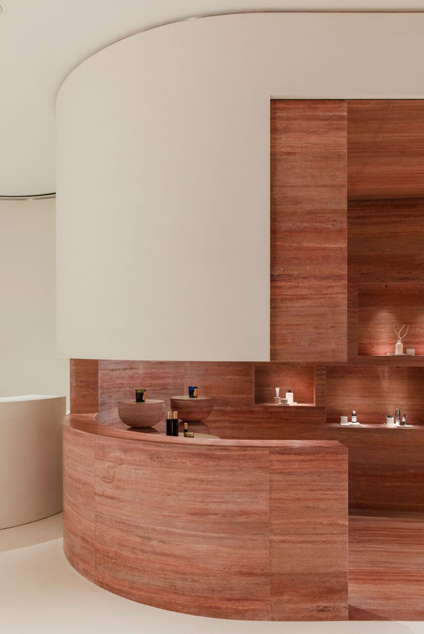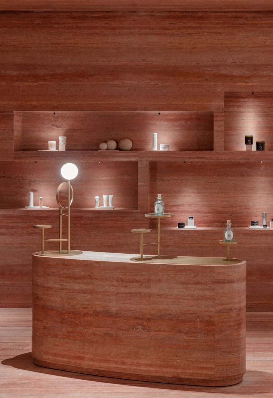 The red stone, natural and honest, add depth to the overall space. The richness of the material and unique scenes in which the products are displayed, reflect the brand’s own journey of exploration.