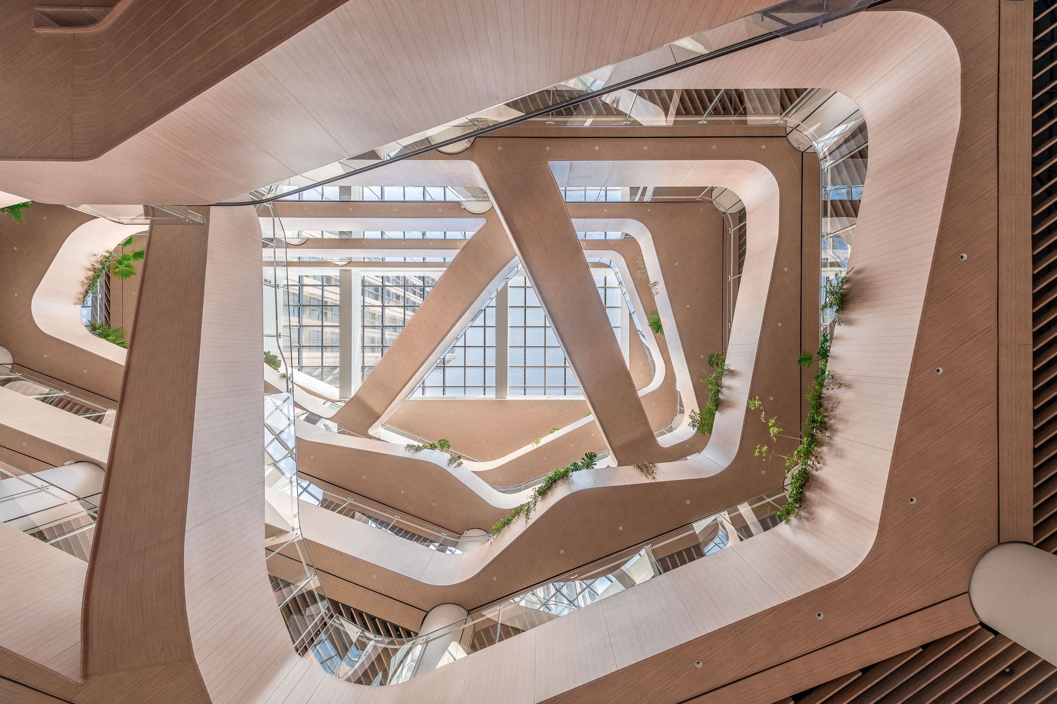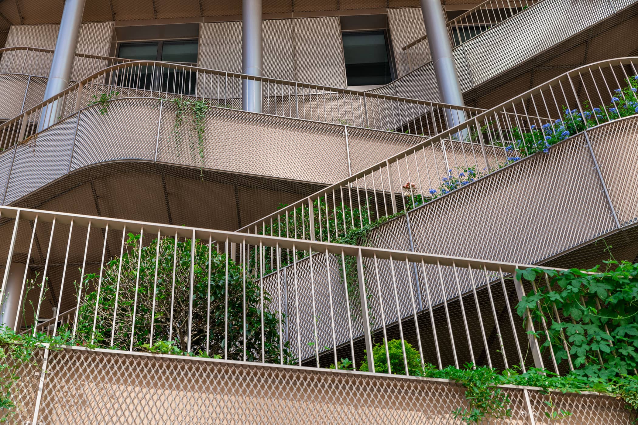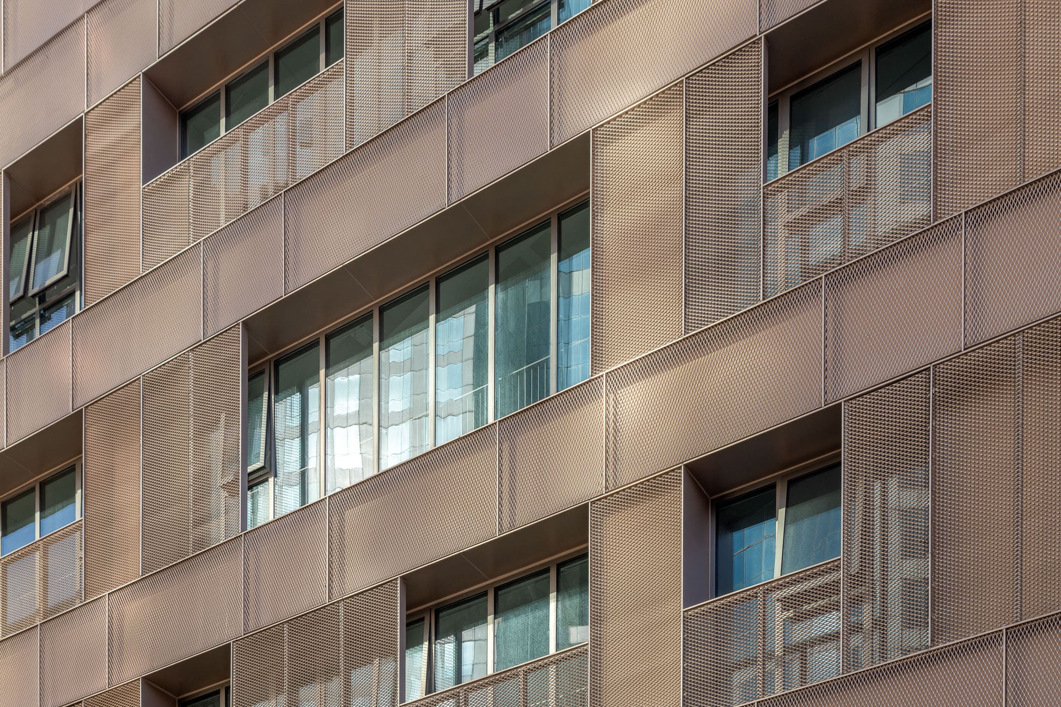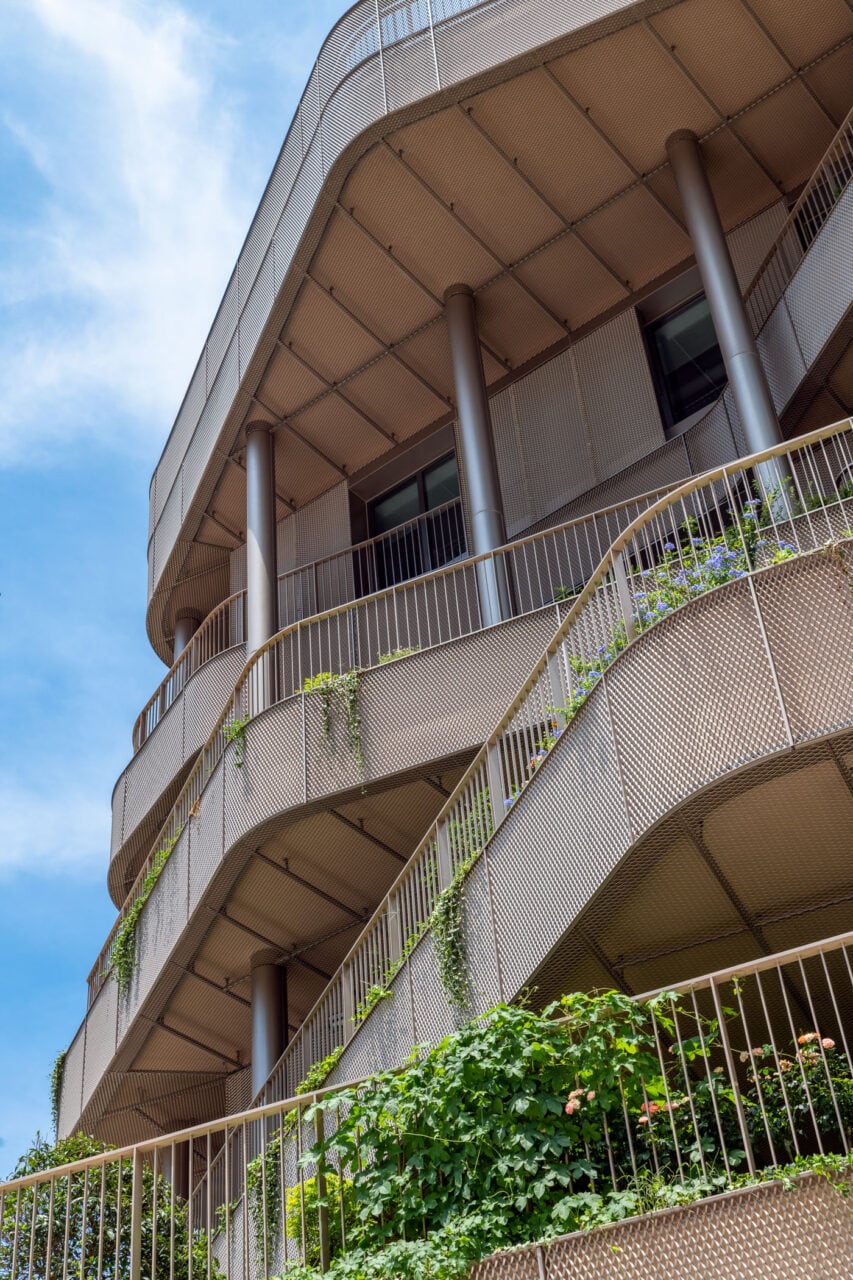 The form language of the building is fluid. The facade is wrapped with a neutral Champagne color mesh. The balustrades extend with hidden lights and plants spilling over the terraces, making the building quite literally breathe new life into the community.